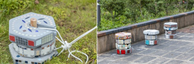 同プロジェクトは、タイル名称統一100周年を記念し、タイルの魅力に光を当てた活動として展開。新築・リフォーム検討時にもらったサンプルやDIYなどで余った使われなくなったタイルを募集し、集まったタイルからアートな重石40個を創作した。作品のコンセプトは「- pile tile – 大きな平面、小さな立体」。同じタイルが並び大きな平面に張り付けられている姿ではなく、素材も大きさも違ったタイルで小さな立体を覆うことを考えたもので、生活の中でタイルの個性を新たな視点から楽しむことのできる重石となっているという。重石は、INAXライブミュージアム内の看板・バス停やタープを支えたり、数個を重ねてスツールとするなど、様々な用途で使用される。