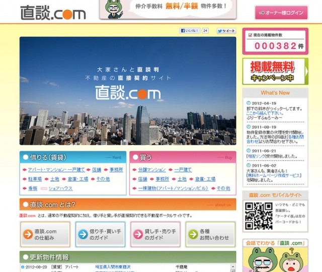 「直談.com」は、物件の家主や不動産業者が消費者向けに直接広告を掲載でき、エンドユーザーと掲載者が直談判できる不動産情報サイト。通常の仲介物件に加え、家主や管理業者が直接登録する物件が掲載されるため、仲介手数料や礼金といった初期費用が比較的安い物件を検索することができる。