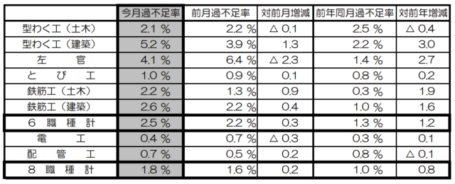 職種別の状況では、前月に続きすべての職種で「不足」となった。型わく工(建築)の過不足率について対前年の増加幅が大きくなっている(2.2%→5.2%)一方、型わく工(土木)の過不足率は対前年の減少幅が大きくなっている(2.5%→2.1%)