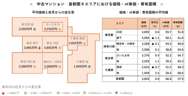 首都圏全体の1戸あたりの平均価格は3824万円で、5カ月ぶりに横ばいとなった。前月比は、東京23区、神奈川県他、埼玉県など5エリアが上昇した一方、東京都下と横浜市・川崎市が5カ月ぶり、千葉県西部が9カ月ぶりに下落し、価格上昇の勢いにやや鈍化がみられた。前年同月比は8エリア全てで15カ月連続上回っている。