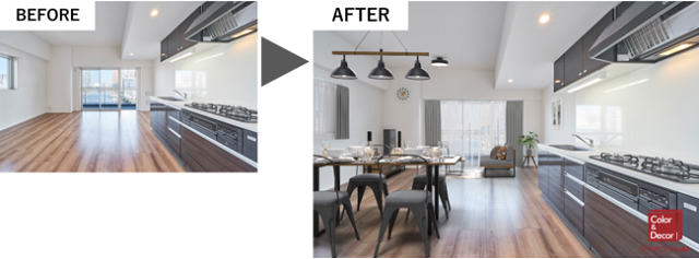 同社は、物件写真・パノラマ写真に3DCGインテリアをインストールし、物件の魅力や暮らし方などをイメージ化するサービス「カラデコファスト」を提供している。パッケージ化されたインテリアスタイルを選択して専用サイトからオーダーするだけで、最短3時間、1枚1980円から納品が可能。
