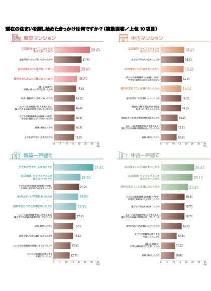『住まい探しのきっかけ』を聞いたところ、新築マンションと中古マンションを購入した人では「生活環境・ライフスタイルを変えたかったから」(新築マンション:28.6%、中古マンション:18.6%)との回答が最多となり、新築一戸建てを購入した人では「子どもができた・生まれたから」(31.4%)、中古一戸建てを購入した人では「前の住まいに不満があったから」(26.4%)が最多となった。