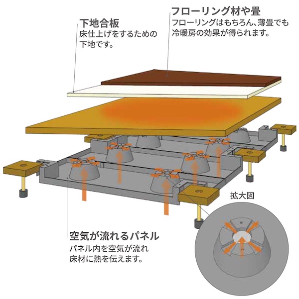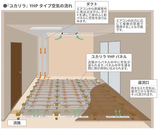 部屋を均一にあたため/冷やし、直接冷風・温風が当たらないため肌の乾燥やホコリの巻き上げを防ぎ、床面温度がそれほど上がらないため低温やけどの心配がない冷暖房システム。