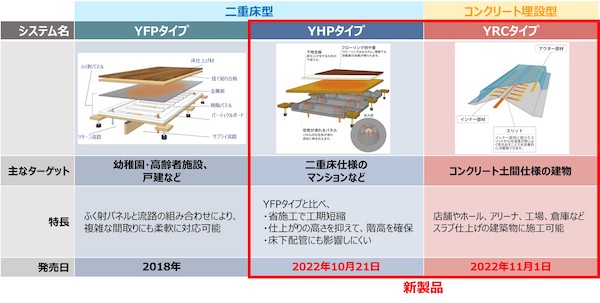 これまでは戸建て住宅や中小規模施設向けの「YFPタイプ」のみだったが、ラインアップを拡充。新しい「YHPタイプ」は、既存のYFPタイプよりも施工性に優れるため短工期が求められるマンション・施設などに、「YRCタイプ」はコンクリート土間仕様の建物に施工できるため倉庫や工場などの大規模空間にも適するという。