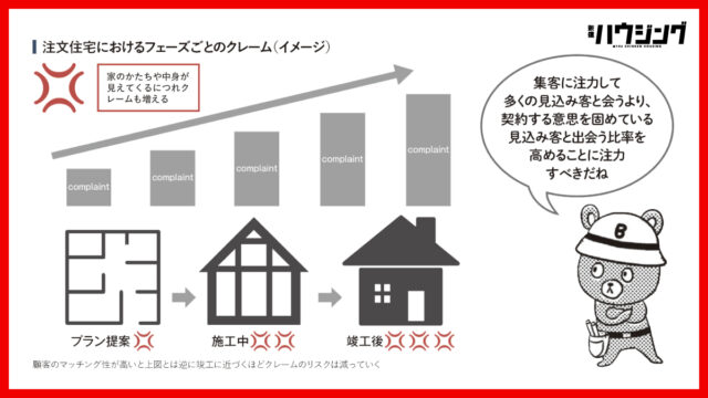 注文住宅における最も有効なクレーム対策は顧客選別によるマッチング性の向上。その上で顧客と対等な人間関係の構築ができれば万全だ。注文住宅の・・・続きはこちら