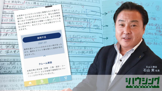 住宅市場が厳しさを増す今だからこそ、クレームによる“失点”は絶対に避けたい。クレームを未然に防ぐことは、自社とその家づくりに対するファン化を促進し、クチコミ・紹介受注を生み出す。本特集では、クレームをなくす工務店の顧客対応に欠かせない、コミュ力(コミュニケーション能力+説明能力)向上のポイントについて解説する。営業から契約、設計、現場、引き渡し、アフターに至るあらゆる場面で、地域で選ばれる工務店はどう対応しているのか。今回は石山工務店(北海道旭川市)の事例を紹介する。