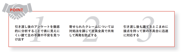 逆にすべての項目が満点だった場合は、担当社員に報奨金を渡す。パーフェクトの達成率は2割ほど。建て主から高い評価をもらえれば報われるということで、社員のモチベーションを高める結果につながっているという。「クレーム予防は社員のストレスを軽減し、楽しく仕事してもらう為にも重要なことだ」(石山さん)。