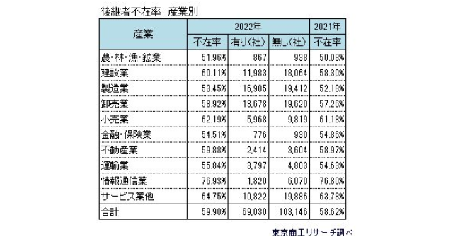 都道府県別では、神奈川県が74.50%(前年74.11%)、東京都が71.33%(同71.16%)で、2都県で70%を超えた。最低は長崎県の28.57%(同24.43%)だった。企業の設立数が多い大都市ほど後継者の不在率が高く、地域差が大きくなっている。