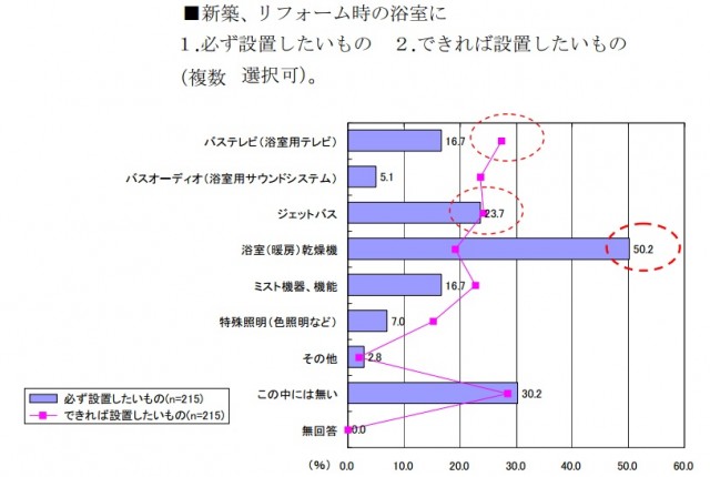 新築・リフォーム時に必ず設置したいものを聞くと、「浴室(暖房)乾燥機」が50.2%で半数を超え、「ジェットバス」23.7%が続いた。できれば設置したいものとしては「バステレビ」の割合が高かった。