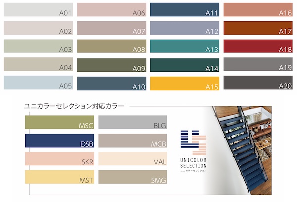最新のデジタル印刷技術により、グレー系のニュートラルカラーからベージュ、アイボリー、カーキ系のくすみカラー、空間のアクセントとなるイエロー、ネイビー、ピンク、レッド系など彩度のある差し色の28色をラインアップ。このうち8色は既発売の室内階段「ユニカラーセレクション」と連動している。