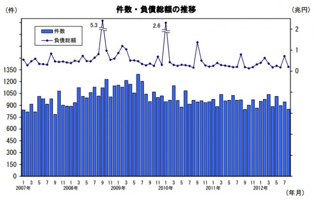 帝国データバンク(東京都港区)は9月10日、2012年8月の全国の企業倒産件数と負債総額を集計、発表した。