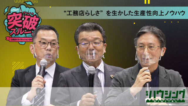 新建ハウジングは10月26・27・28日の3日間、東京ビッグサイトで行われたジャパンホーム&ビルディングショー会場で、“突破(ブレークスルー)”をテーマとして掲げ、「工務店ミライセッション」を開催。オンラインでも配信した。地域工務店が厳しさを増す市場を突破し、工務店らしい家づくりと経営を未来へとつないでいくためのあり方を議論。27日のセッション「工務店らしさを生かした生産性向上ノウハウ」では、プラン・設計・規格、現場管理・品質の標準化や、大工に受発注業務を移管(任せる)といった、工務店の実情に即した生産性向上の仕組みについてディスカッションした。