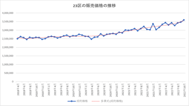 東京都23区は、2022年度に入ってから在庫数が下降傾向にあり、10月は前月からさらに減少。一方、在庫回転率は高水準を維持しており、売却までの価格改定数が大きく低下している。需給トレンドに即応した価格形成がみられ、今後も価格高騰は継続すると予測される(グラフ下)。