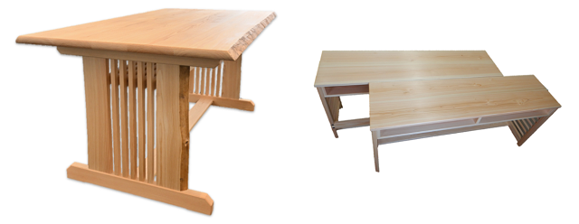 セミオーダー家具は、「ダイニングテーブル」(幅150~160cm×奥行70~86cm、高さ70cm)、「ハーフテーブル」(幅150~160cm×奥行40cm、高さ70cm)を用意。県内の材木店、木工作家、デザイナーなどのチームが開発したデザイン性の高い高級家具で、寸法を指定できる受注生産品。寄附金額はそれぞれ150万円。