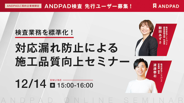 同社は新しい「ANDPAD検査」を使って検査業務の標準化、作業負荷の軽減につなげる方法を紹介するウェビナーを12月14日(水)15:00~16:00に開催する。詳細はhttps://andpad.jp/seminars/41212202inspection/から。