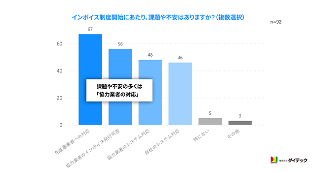インボイス制度を認知している人に課題や不安を聞いたところ、73%が「免税事業者への対応」と回答。次いで「協力業者のインボイス発行可否」、「協力業者のシステム対応」と続き、協力業者への対応を懸念していることがわかった。また、自社の準備とともに「協力業者への発行確認」「協力業者への説明会実施」などを並行して進めている現状が明らかとなった。