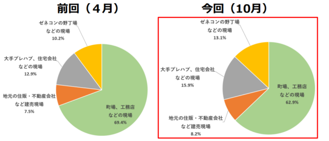アンケートに回答した一人親方のうち、消費税の免税事業者は約7割。普段取引のある上位企業は、「町場、工務店などの現場」(62.9%)が最も多く、次いで「大手プレハブ、住宅会社などの現場」(15.9%)、「ゼネコンの野丁場などの現場」(13.1%)、「地元の住販・不動産会社など建売現場」(8.2%)。