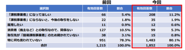 上位企業からの通知に関する質問で、「課税業者になってほしい」と通知があったと答えたのは11.2%、「課税事業者にならないと今後の取引をしない」は1.9%、「雇用したい」は0.6%。「特に何も言われていない」は80.1%だった。同制度の導入により消費税分の収入が減ることが懸念されるが、上位企業から請負金額を「据え置く」と通知があったのは18.2%、「消費税負担分を引き上げる」は13.6%だった。一方、「何も通知されていない」は68.2%で大半を占めている。