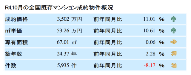 全国の既存マンションの成約価格は前年同月比で11.01%上昇、成約㎡単価は10.61%上昇し、ともに29カ月連続してプラスとなった。専有面積は前年同月比で2カ月連続してプラス、築年数は前年同月比で17カ月連続してプラスとなった。物件数は前年同月比でふたたびマイナスに転じた。