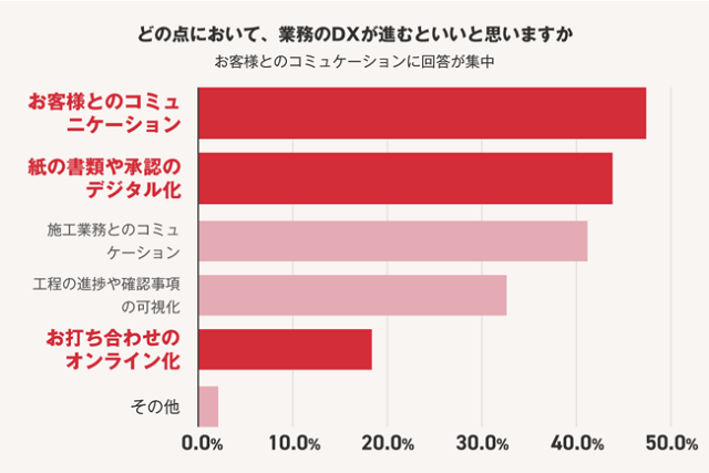 また、顧客とのやり取りで、最も頻繁に使った連絡手段は「電話」が56.3%、「メール」が25.9%となり、スマホアプリやDXを活用した接客が進んでいないことも浮き彫りになった。DX化を期待する業務は、「お客様とのコミュニケーション」(47.7%)が最も多く、2位が「紙の書類や承認のデジタル化」(44.8%)となり、顧客との情報共有に関する項目が、「施工業者とのコミュニケーション」「工程の進捗や確認事項の可視化」などの施工管理関連を上回った。