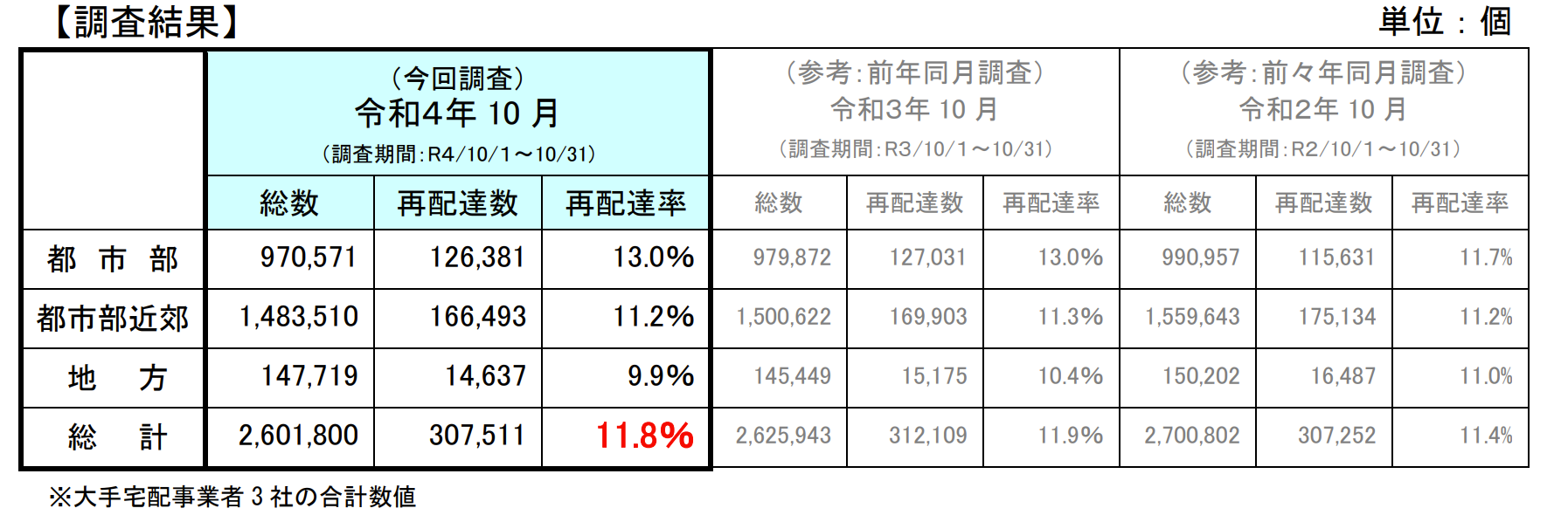 本調査は、4月と10月の年2回、大手宅配事業者3社(佐川急便、日本郵便、ヤマト運輸)を対象に2017年10月から実施している。