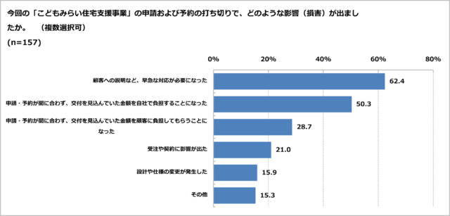 急な受付締切に、現場では6割超の工務店が「顧客への対応など、早急な対応が必要になった」など、混乱が発生しているようだ。補助金を充当するはずだった金額については、「顧客に負担してもらうことになった」のは28.7%にとどまり、50.3%が「自社で負担することになった」と回答している。