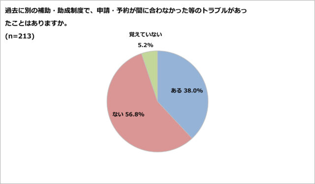 過去、補助・助成制度の利用にあたってトラブルになった経験があるのは全体の38.0%。以前から一定数のトラブルは発生していると見られる。