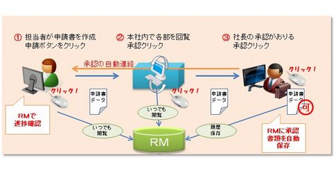 新機能は、電子化された書類を決裁ルートに従い、回覧・決裁する仕組み。これにより、日常業務の経費申請や勤怠申請、稟議申請など、社内での申請と決裁を効率的に行うことが可能となる。顧客情報とワークフロー機能の連動も可能で、顧客ごとの決裁履歴、添付書類を自動的に保存できる。