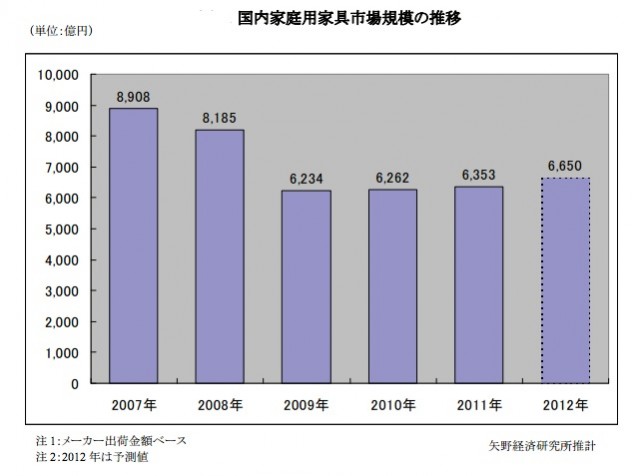 矢野経済研究所(東京都中野区)は9月25日、2012年3月〜8月に行った国内家庭用・オフィス用家具市場の調査結果を発表した。