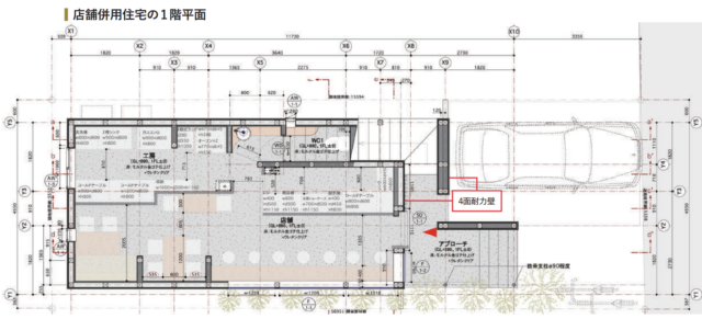 ◉木造3階建の店舗併用住宅。1階は店舗で2・3階が住居。建て主からは店舗入口へのアプローチと駐車場は別々、店舗面積は最小限、将来、駐車場上部にカフェ用バルコニーを増築、という要望があった