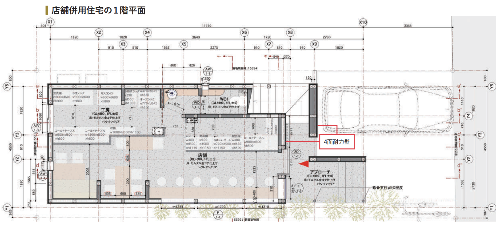 ◉事例は細長い平面で跳ね出しているため、1階の間口方向の壁量が圧倒的に不足する。そこで柱と土台、梁を2重に配置。各軸組の表裏に構造用合板を張った「4面耐力壁」を2箇所に設置