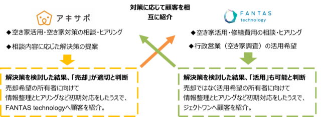 今回の業務提携により、空き家の所有者を変えない空き家活用事業を展開するジェクトワンと、空き家再販事業を行うFANTAS technology双方のサービスの提案が可能となる。両社の共通の目的である空き家問題の抑制を目指して、まずは、一都三県の空き家所有者に対し、対策に応じて相互に顧客を紹介する。