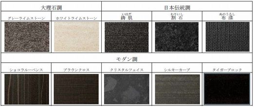 同製品は、表面材・デザイン・錠前などを自由に組み合わせることができるマンションドア。今回新たに追加するのは、大理石調の「グレーライムストーン」「ホワイトライムストーン」、日本伝統調の「鋳肌」「割石」「布漆」、モダン調の「ショコラルーベンス」「ブラウンクロス」「クリスタルフェイス」「シルキーカーブ」「タイガーブロック」。