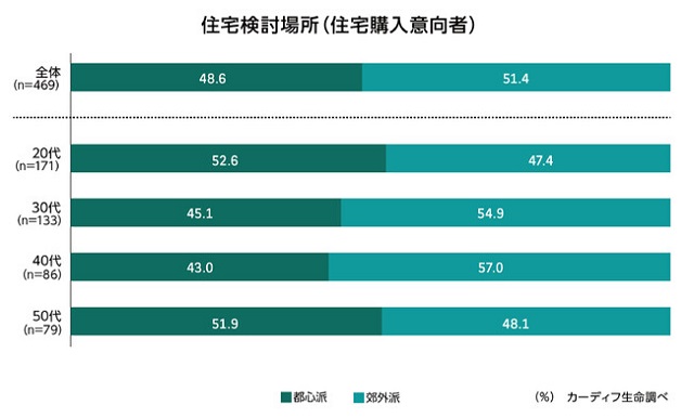 住宅購入意向のある人に検討場所を聞いたところ、「都心派」が48.6%、「郊外派」が51.4%とほぼ半々の結果となった。「郊外派」が多くなるのは30代(54.9%)、40代(57%)で、理由として30代は「安価で広い住宅を購入できるから」(37%)、40代は「時間に縛られず、のんびりした生活を送りたいから」(31%)がそれぞれもっとも多くなった。