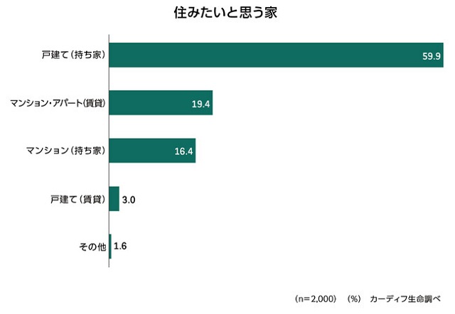 カーディフ生命保険(東京都渋谷区)は12月15日、20歳~59歳の全国の男女2000人を対象に実施した「第4回 生活価値観・住まいに関する意識調査」の結果を発表した。住みたいと思う家について聞いたところ、約6割が「戸建て(持ち家)」と回答。今後、家を買うとした場合の希望購入金額は、平均2846万円だった。世代別では、30代が平均3205万円と他の年代よりも400~500万円ほど高くなっている。