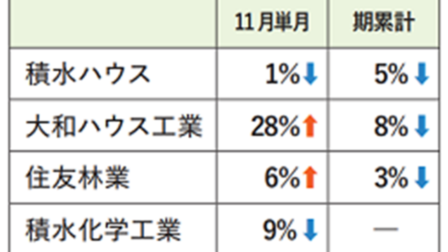 ハウスメーカー各社が12月12日までに11月の戸建て注文住宅の受注速報値(対前年同月比、積水化学工業のみ棟数ベース、旭化成ホームズは集合も含む)を発表した。昨対で・・・続きはこちら