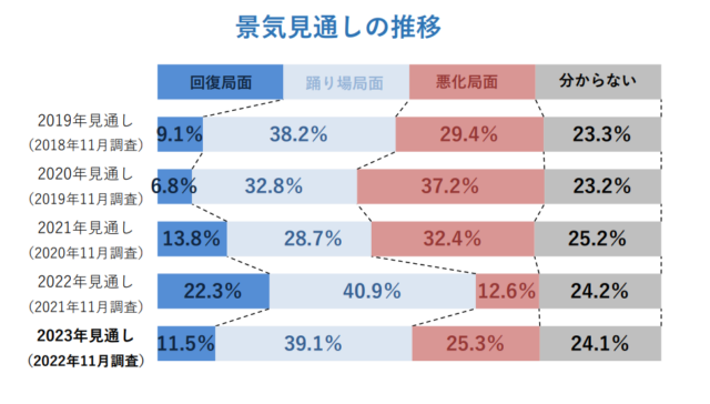 2023年の景気見通しについて尋ねたところ、「回復」局面になると見込む企業は2022年の景気見通し(2021年11月実施)から10.8ポイント減少し、 11.5%となった。また、「踊り場」局面は39.1%と2022年見通し(40.9%)から若干減少した。「悪化」局面を見込む企業は前年から倍増。同12.7ポイント増え、25.3%と4社に1社となった。
