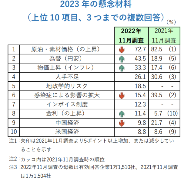 2023年の景気に悪影響を及ぼす懸念材料を尋ねたところ、「原油・素材価格(の上昇)」が72.7%(前年比9.8ポイント減)で突出して高かった。次いで、「為替(円安)」(43.5%、同24.6ポイント増)や「物価上昇(インフレ)」(33.3%、同15.9 ポイント増)が前年から急増した。そのほか「人手不足」(26.1%)、ロシア・ウクライナ問題、東アジア情勢など「地政学的リスク」(18.5%)が上位に並んだ。また、2023年10月から制度が開始される「インボイス制度」についても12.3%の企業で懸念材料と見込んでいる。