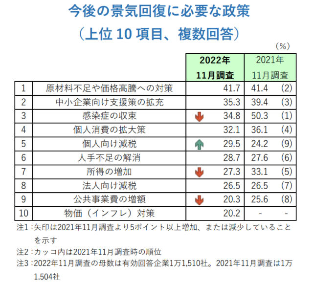 今後、景気が回復するために必要な政策を尋ねたところ、企業の7割超が2023年の懸念材料とした「原材料不足や価格高騰への対策」が41.7%でトップとなった。以下、補助金・給付金などの「中小企業向け支援策の拡充」(35.3%)や新型コロナウイルスなどを含む「感染症の収束」(34.8%)、「個人消費の拡大策」(32.1%)が3割台で並んだ。さらに、「個人向け減税」(29.5%)や「人手不足の解消」(28.7%)、個人向け手当の創設など「所得の増加」(27.3%)が続いた。