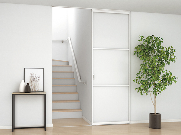 引戸・折戸で空間を仕切る「プレイス スウィング」は、リビング階段に使用することで冷気がリビングに流れ込むのを防止。オプションの「アウトセット納まり」の場合、既存の開口スペースに袖壁を設置しなくても引戸を後付けすることができる。