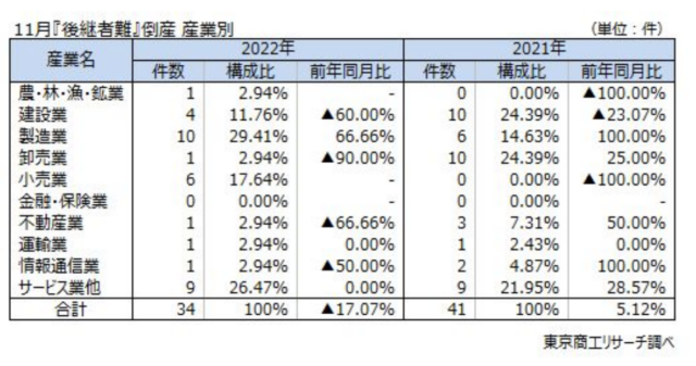 同調査は「人手不足」関連倒産(後継者難・求人難・従業員退職・人件費高騰)から、2022年11月の「後継者難」倒産(負債1000万円以上)を抽出、分析したもの。