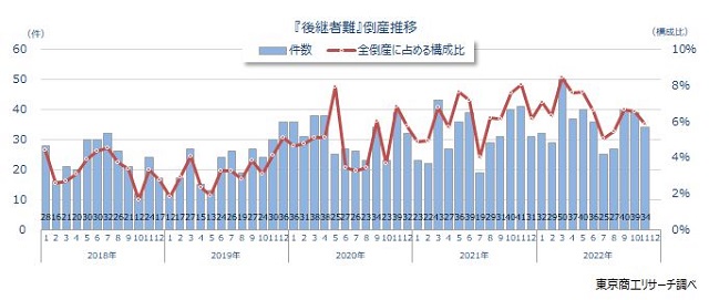 東京商工リサーチ(東京都千代田区)は12月19日、11月の「後継者難倒産」について状況調査の結果を公表した。後継者不在による「後継者難」倒産(負債1000万円以上)は、34件(前年同月比17.0%減)で、5年ぶりに前年同月を下回った。30件台にとどまったのは、2020年の39件以来2年ぶり。倒産全体の構成比は同2.2%減の5.8%だった。一方、2022年の11月までの累計は前年同期比11.1%増の389件で、2021年の年間件数381件を上回っており、初の400件台がほぼ確実となった。