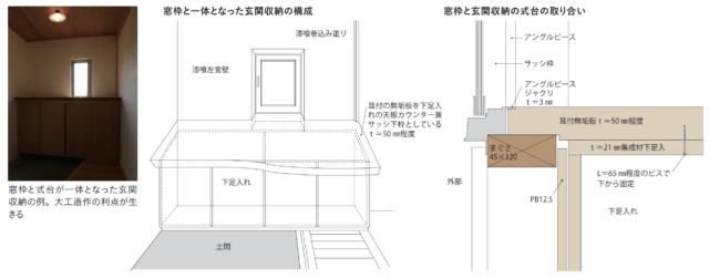 大工が家具をつくる利点は家具製作を工程に組み込めることだ。特に窓枠を組み込んだ収納兼カウンターなど建物と一体化した家具の製作に向いている。大きな壁面収納も大工造作に適している。家具屋に依頼すると工場で製作した大きな家具を搬入して取り付けることになるので管理が大変だ。このほか周辺の仕上げ材との絡みを臨機応変に対処できるため、左官を家具に塗り当てるなどの納まりもしやすい。このほか大工がつくるほうが多少のコストダウンになるのも利点だ。
