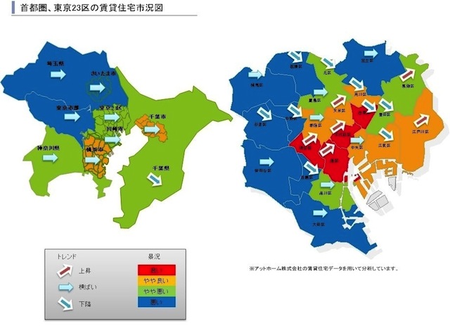 東京23区では千代田区、渋谷区が「やや良い」→「良い」に、江戸川区が「やや悪い」→「やや良い」に、葛飾区が「悪い」→「やや悪い」へと好転。一方、墨田区が「やや良い」→「やや悪い」、板橋区が「やや悪い」→「悪い」となった。山手線内から東側にかけて市況が「良い」「やや良い」地域が集中した。