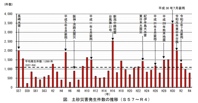 国土交通省は12月23日、今年(2022年1月1日から12月21日まで)発生した土石流、地すべり、がけ崩れなどの土砂災害件数(火砕流は除く)の速報値を公表した。今年は42の道府県で788件の土砂災害が発生し、死者2名、人家被害284戸の被害が出た。特に8月から9月の合計では、32道県で524件の土砂災害が発生し、直近10年の同期間における平均発生件数(366件)を上回ったことがわかった。