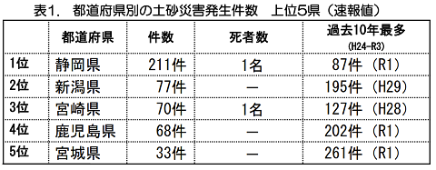 8月3日からの大雨では全国各地の36のアメダス観測地点で1時間降水量の観測史上1位を更新し、土砂災害が局所的かつ集中的に発生。台風第15号では全数の9割以上の167件の土砂災害が静岡県で発生した。これは単一の台風、単一の県で発生した件数として歴代2番目となる。歴代で最も多いのは「令和元年東日本台風」での宮城県の254件。