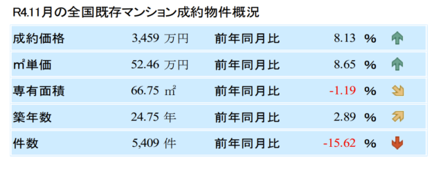 全国の既存マンションの成約価格は前年同月比で8.13%上昇、成約㎡単価は8.65%上昇し、ともに30カ月連続してプラスとなった。専有面積は前年同月比で3カ月ぶりにマイナスに転じた。築年数は前年同月比で18カ月連続してプラスとなった。物件数は前年同月比で2カ月連続マイナスとなった。