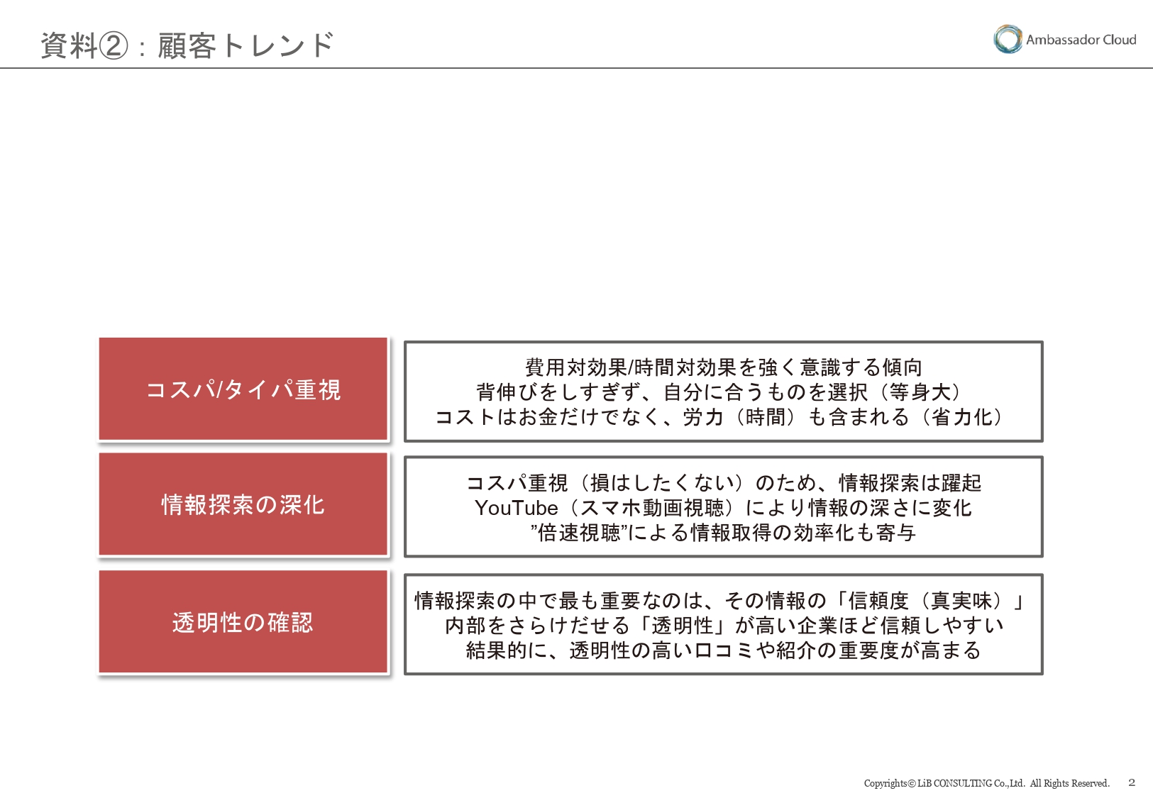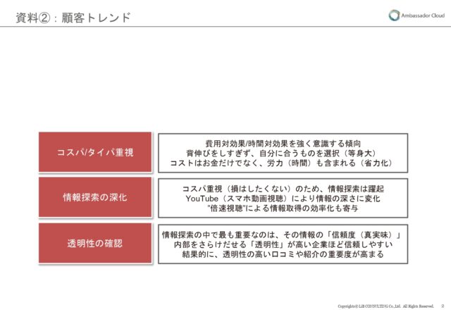 一方で、すべてを自分の目で確かめるにはタイパが悪いので、信頼できる人からの紹介や口コミがより大事になってくる。企業情報の透明性が高い企業ほど、信頼が得られる構図になった。Instagramにおける購入検討客と購入済顧客(OBOG)のやりとりも増加してきているのがその証左である。事前に購入客のより具体的な評価を知りたいと思うのは必然であろう【資料3】。