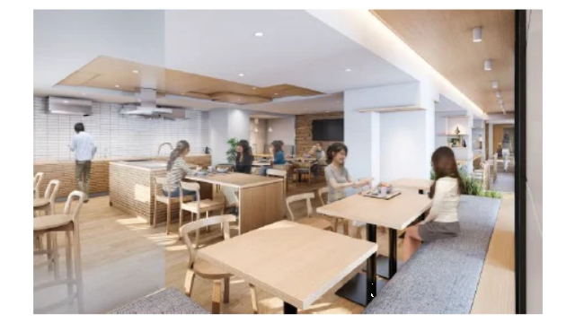 また、サステナブルな環境を感じられるよう、内装の天井や壁面にも木調のデザインを取り入れ、温かみのある空間を構築する。共用部のカフェテリアではスキップフロアを採用し、学生同士が自然と交流の機会を持てるよう、座っていても歩く人と目線が合うような設計としている。