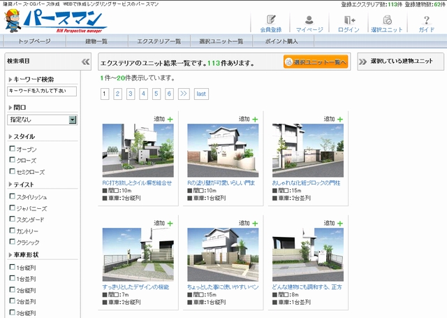 新サービスは、3次元の建物データに、エクステリアプランをウェブ上で合成し、プレゼン用パース画像を提供するサービス。サイトに用意されている建物または、自社の建築CADで作成した建物のデータを使い、3ステップで作成できる。
